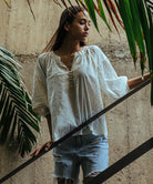 This iconic Rose and Rose style has been given a glamourous update in gold lurex decorated cotton dobby, with contrasting Caribbean-inspired appliqué motifs and decorative stitching in sand. Elasticated blouson ¾ length sleeves make styling a breeze. Slips over the head when buttons are open.