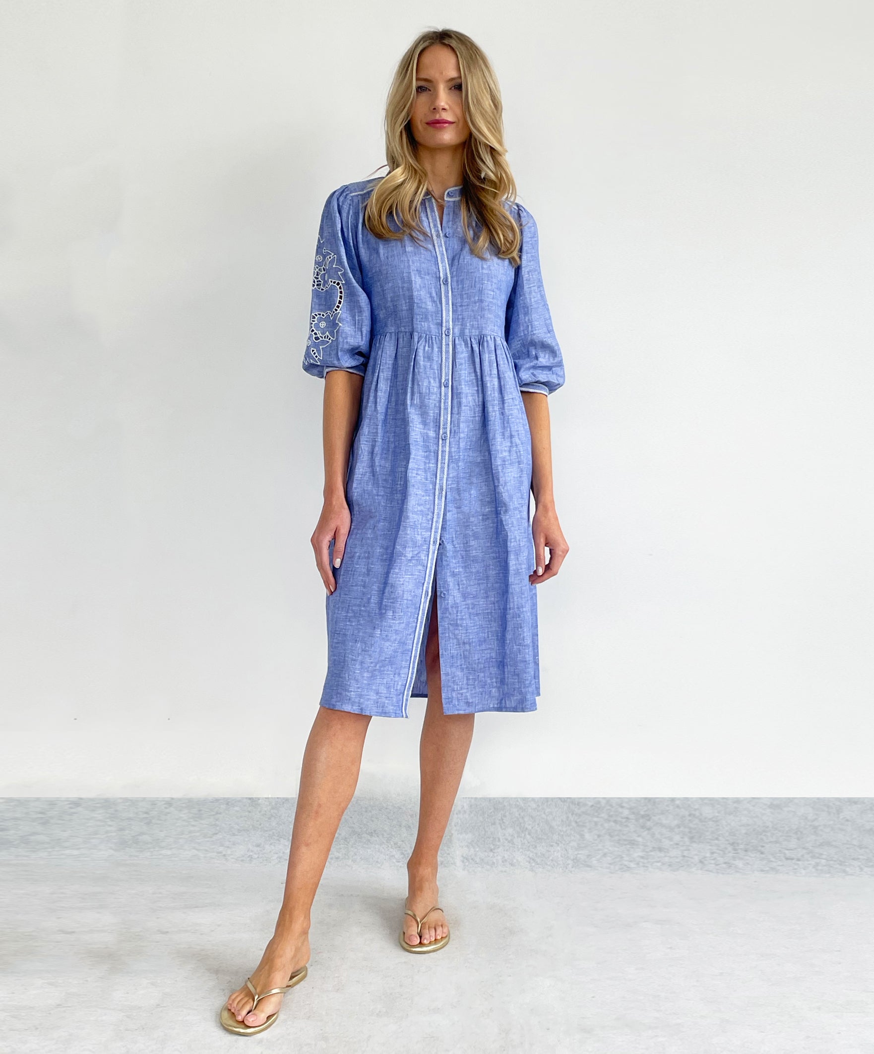 The button through Monument shirt dress is a wardrobe staple, taking you from day to evening with ease. Made from beautiful French Blue linen chambray, the styling seams are punctuated with herringbone embroidery and the sleeves feature embroidered and cut out flower motifs, handy pockets are concealed within the side seams. Wear with some buttons undone to reveal a little décolletage and show some leg!